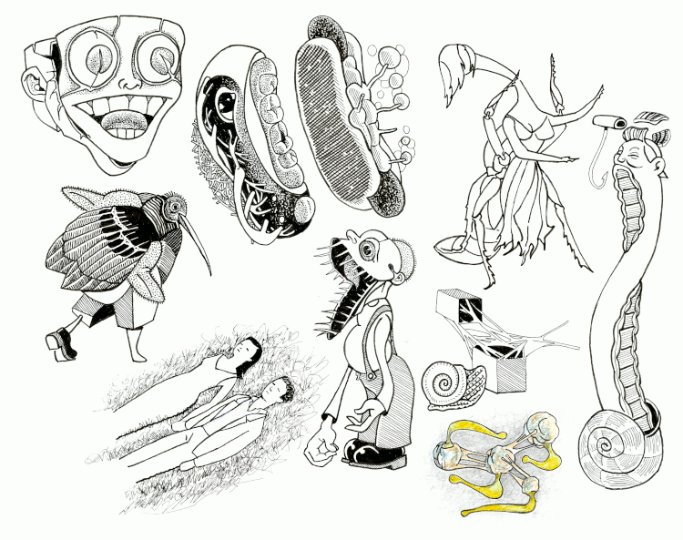 Embellished Sketches: My sketchbooks were, for years, where I worked out elements for comic strips and animations. More recently they have become an integral part of my creative process for paintings and stand-alone drawings. Originally I planned to trim these drawings with finishing touches, but only the first five received this treatment.