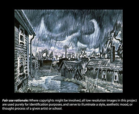 The idyllic landscape had gone off-color through the windshield. Jack-o-lanterns, in various progressive stages of pyorrhea, poked out from porches on either side of the glistening street. The scene was reminiscent of a Charles Burchfield’s watercolor, where puddles of bluish-brown pigment were blown over paper of the roughest tooth.