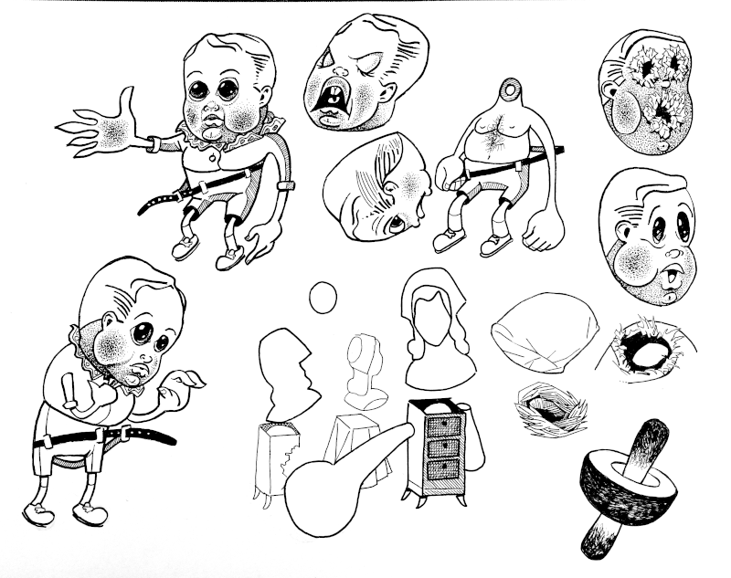 Embellished Sketches: My sketchbooks were, for years, where I worked out elements for comic strips and animations. More recently they have become an integral part of my creative process for paintings and stand-alone drawings. Originally I planned to trim these drawings with finishing touches, but only the first five received this treatment.